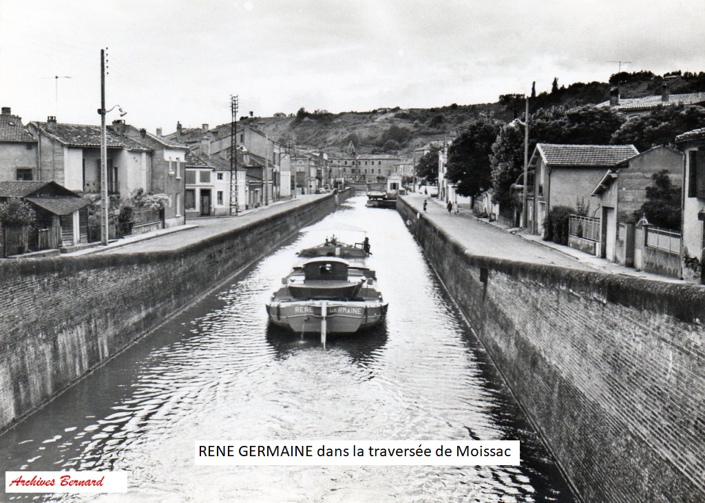 Ici le bateau navigue entre les murs en brique rouge de Moissac.