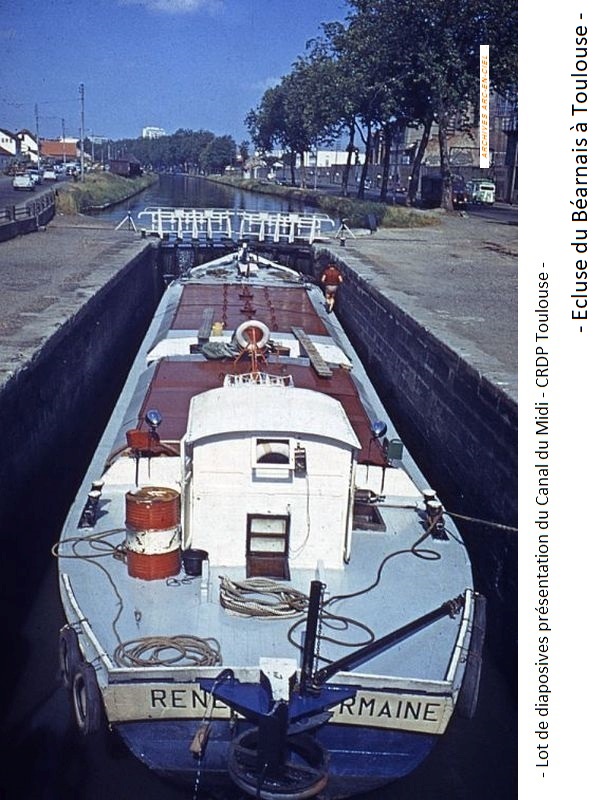 Le bateau sort du grand bassin de Castelnaudary. Il se présente sous le pont avant d’entrer dans l’écluse de Saint Roch.