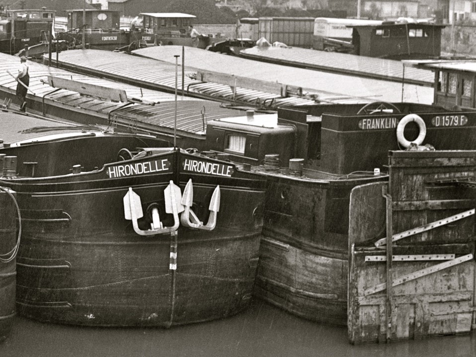 Péniches amarrées sur le canal de la Marne au Rhin au port Saint-Georges à Nancy (Meurthe-et-Moselle) en septembre 1963. Cette photographie illustre une activité portuaire et fluviale encore dynamique au début des années soixante. On remarquera au second plan, la présence d'une grue de manutention de marchandises (notamment du charbon) et en arrière-plan, l'usine électrique de la rue Tapis-Vert avec son dôme caractéristique et le pont des Tiercelins à gauche.