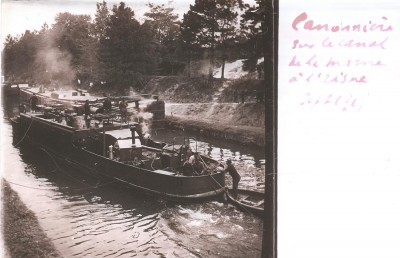 L'image est tirée d'une plaque de verre stéréoscopique. La légende est claire et précise : la photo a été prise en septembre 1915 sur le canal de la Marne à l'Aisne (on pourrait peut-être rajouter : dans les environs du Mont-de-Billy).