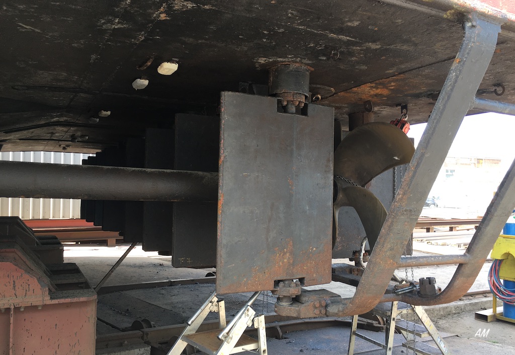 Vu aujourd'hui au CHS, le Goeland est sur cale, les quatre moteurs sortis. Détail, un des tubes d'étambot et le flanking: