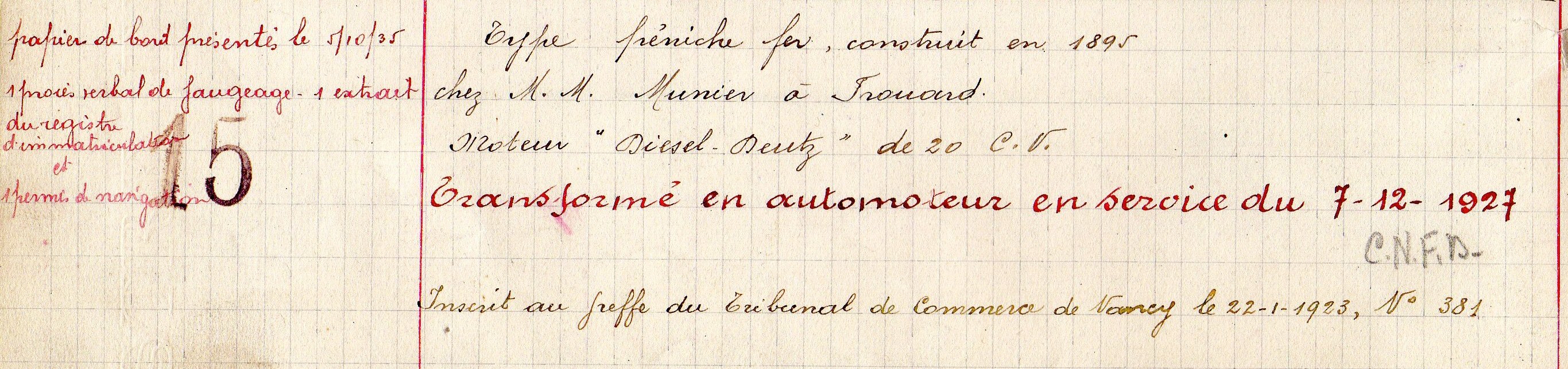 tous les renseignements y sont : construit en 1895 chez Munier à Frouard, motorisé en 1927 avec un moteur Deutz-Diesel de 20cv