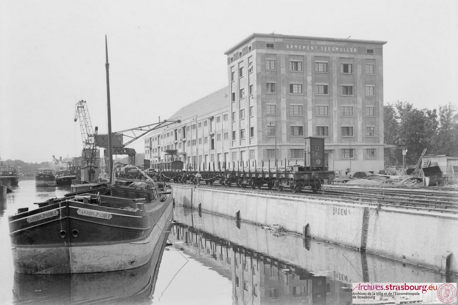 Sur le site des archives de la ville et de l'eurométropole de Strasbourg, on trouve cette belle photo qui doit dater des années 30, avec le bassin d'Austerlitz et l'entrepôt Seegmuller :