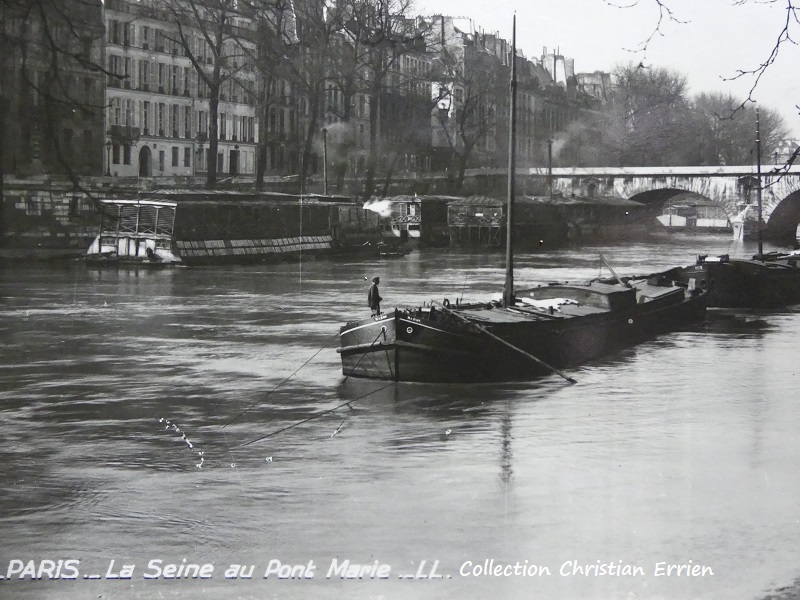 Voici une CP datée de 1938 montrant la Seine en crue au niveau du pont Marie , le premier bateau est le MAROC