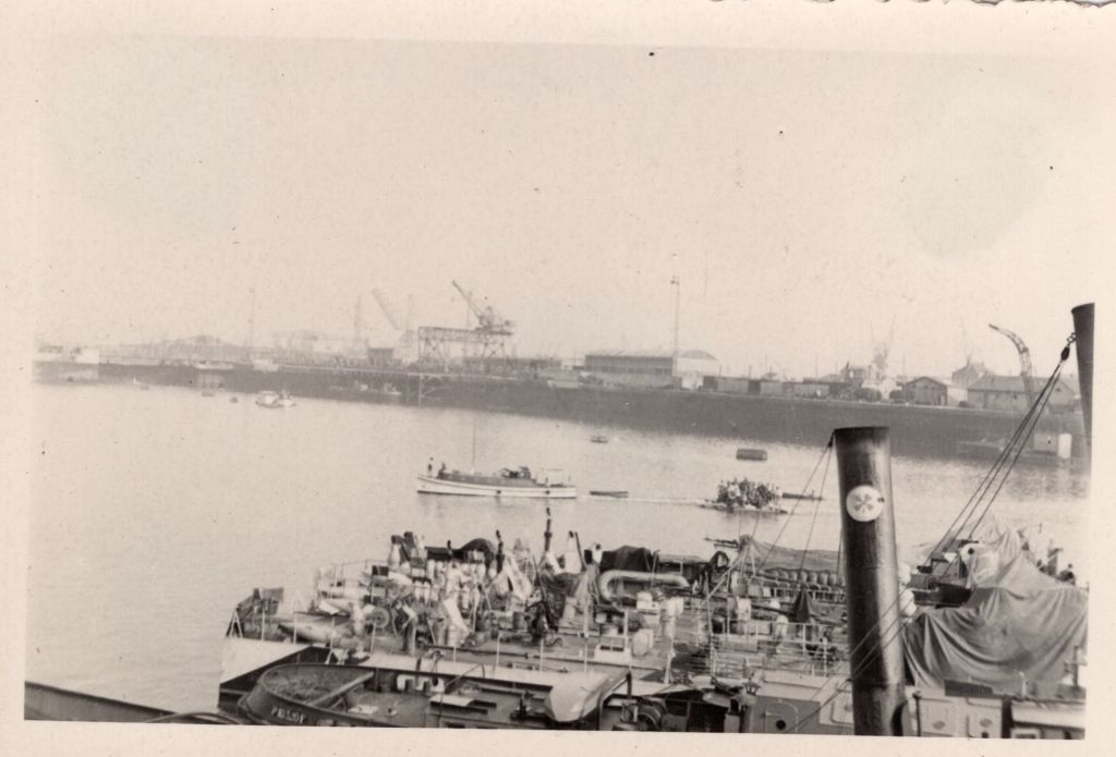 En premier plan la cheminée d'un remorqueur de l'Union Normande, et en arrière-plan deux Räumboote de la Kriegsmarine.