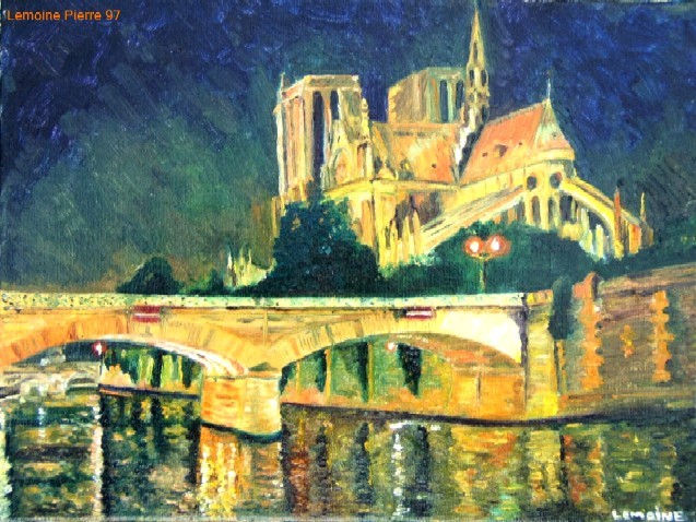 Lors d'une emission tele sur le musee d'Orsay, j'ai ete attire par une tres belle peinture de Jean-Francois Millet : « parc a moutons, clair de lune. C'est un tableau de nuit. La seule lumiere est lunaire et elle se reflete sur la toison des moutons. J'ai eu envie egalement de m'essayer a cet exercice. J'ai vu que Statio avait mis une carte de nuit de la cathedrale saint Etienne d'Auxerre. C'est pourquoi je vous envoie une autre cathedrale. Qui dit lumiere, dit Paris. J'ai peint Notre Dame de Paris et la Seine au pont de l'Archeveche ( Eddy a ecrit que cette rubrique devait parler de l'eau, je crois que je suis sauve). Les peniches dorment et tous les chats sont gris. Ce pont est tres etroit et sa faible hauteur (le plus bas sur ce bras de la Seine) pose des problemes de navigation.