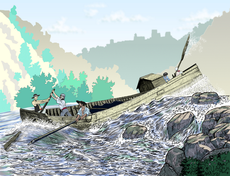 Le Saut du Perron, ce fut mon premier saut de seuil en kayak en 1971. En fait, pour nous kayakistes, c'était un gentil toboggan en pente douce. Mais on imagine facilement qu'avec un bateau de plus de 20 m portant 20 tonnes de charbon, ça devait être une autre paire de manches.