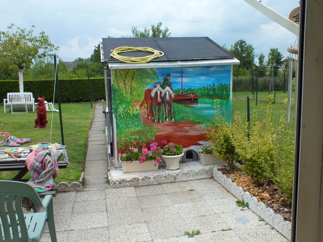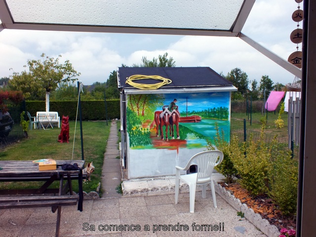 bonjour!! comme je n ait plus beaucoup d inspiration je me suit dit pourquoi !je ferais pas une fresque dans mon jardin!!comme il y a un pilonne avec lumière du cotée de la maison: la nuit quand je suit éveiller je voie ma fresque avec cette lumière qui me donne l impression que le canal est derrière chez moi !!ses supers voila le début