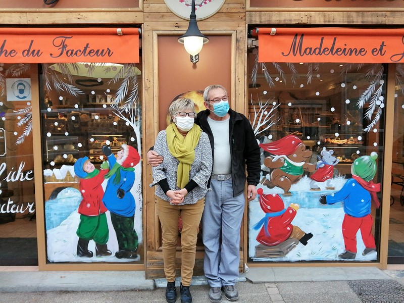 Déco sur vitres à la boulangerie d'Hauterives dans la Drome (village du facteur Cheval).