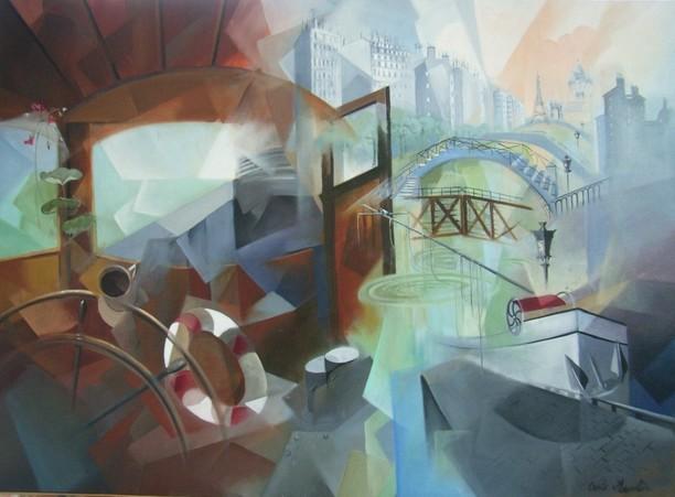 Sablons: huile sur toile peinte par Odile.L'on voit : le pont,le chateau,Moly,la maison de Fanely Revoil, une ancre (village de Bateliers) un heron etc ....