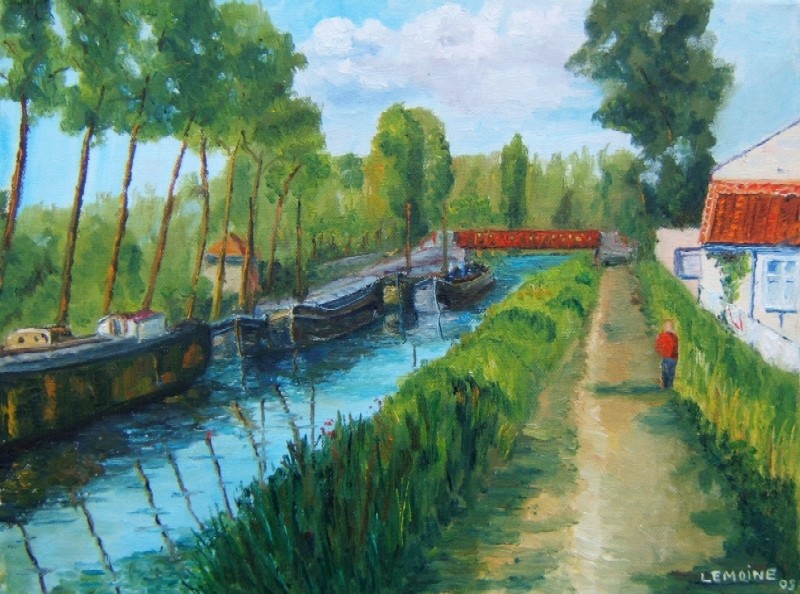 Le Libellule se trouve amarre dans la branche de Bellecourt, darse d'un ancien charbonnage sur le canal de Charleroi-Bruxelles a Seneffe. Dans le club house du port de plaisance , j'ai trouve une vieille photo en noir et blanc. Donc j'ai compose cette petite toile d'un passe que je n'ai pas connu