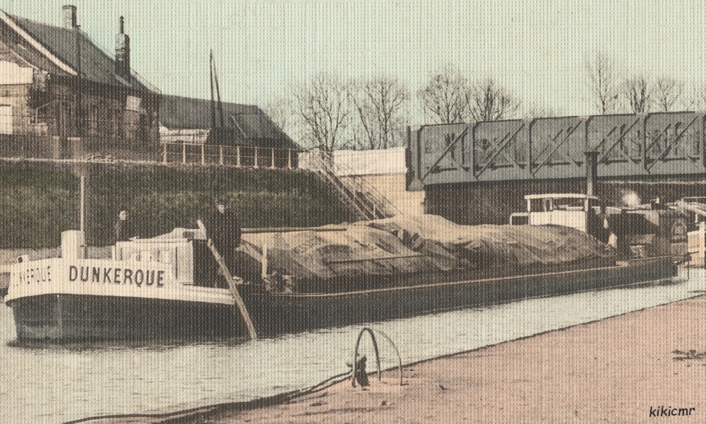 - tout d'abord une carte postale (exemplaire non écrit) sur laquelle il apparaît, naviguant sur le canal de Saint-Quentin, à Pont-Tugny (Aisne)
