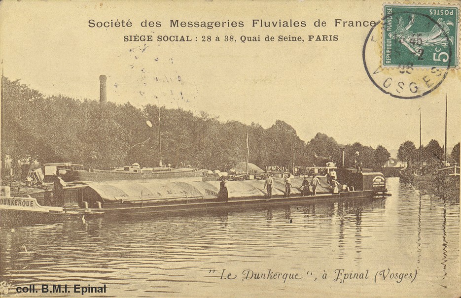 Hier (jeudi 14 mai 1907) est arrivé, dans le port d'Épinal, un bateau automoteur, le DUNKERQUE, des Messageries Fluviales de France, qui transporte des barres en acier, de Pont-Saint-Vincent à Marseilles-les-Aubigny (Cher). Il suit le canal de l'Est, descend la Saône et prendra le canal du Centre.