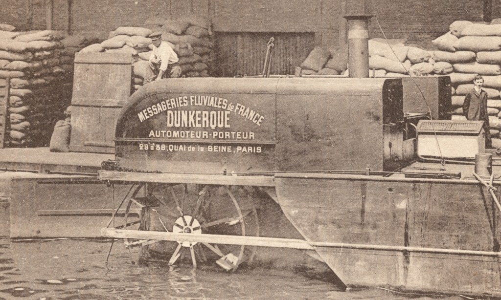 Les invités ont assisté au départ du chaland automoteur (la Ville de) DUNKERQUE, caractérisé par les roues à aubes placées à l'arrière, et par le dispositif nouveau du moteur, qui s'élève ou s'abaisse automatiquement suivant le chargement, de manière à laisser toujours aux roues de propulsion la même immersion. (La Ville de) DUNKERQUE doit faire en neuf jours le trajet par fleuves et par canaux de Paris à Dunkerque, trajet qui demande actuellement cinq semaines.