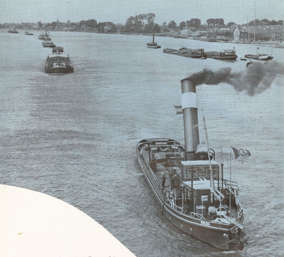 Une photo extraite du livre "Le Rhin et ses voies de communication", dans les années 50, présentant des cartes du Rhin ainsi que l'entreprise "N.V. Nederlandsche Rijnvaartvereeniging" (NRV), montrant un remorqueur de sa flotte :