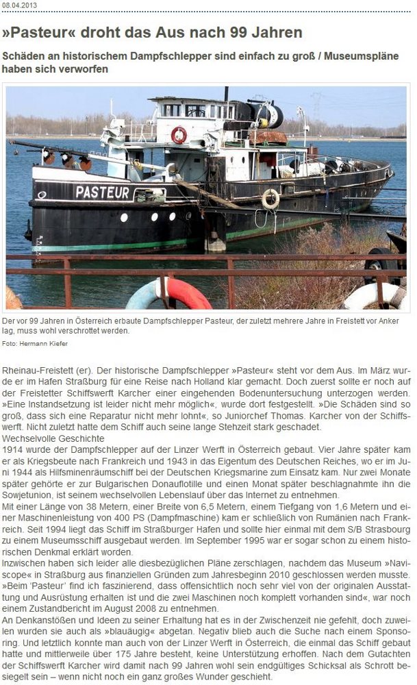 La France étant toujours à la pointe de la sauvegarde de son patrimoine fluvial, j'ai entendu dire qu'il a été vendu aux Hollandais pour un projet de sauvegarde. Il est passé au chantier à Freistett en fin d'année dernière, et il y a quelques jours donc, comme je l'écrivais au début de l'article, il a été aperçu descendant le Rhin à bord d'un 135m. Les bruits qui courent à différents endroits ne son pas optimistes sur son avenir, affaire à suivre...