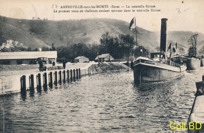 - Amfreville RENAISSANCE Premier train avalant entrant dans la nouvelle écluse carte oblitérée en 1937