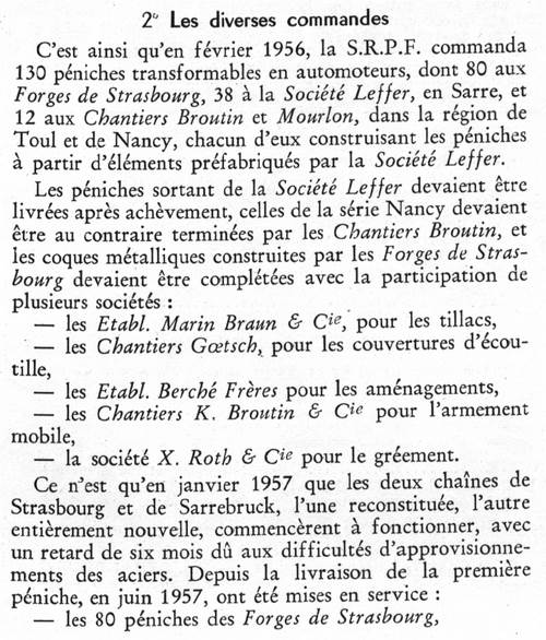 La construction en acier Thomas ou en acier Martin, les timoneries abaissées de 18cm, les bateaux avec ou sans cambuse, on y apprend plein de chose sur les raisons qui ont fait tous ces petits détails des productions en grande série de la société Leffer de Sarrebruck et des Forges de Strasbourg. Et on lit aussi que ce qui est rentré dans le langage courant batelier sous le nom de "mixte", c'est à dire les bateaux avec l'avant et l'arrière construits par la société Leffer et la partie centrale et l'aménagement par les chantiers Mourlon et Broutin s'appelait à la SRPF la "série Nancy".