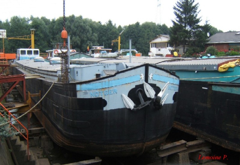 La cale seche avec le Notger , un 39 m. construit chez Michot a Thuin et reconnaissable a la fleur de lys sous les fargues de l'etrave