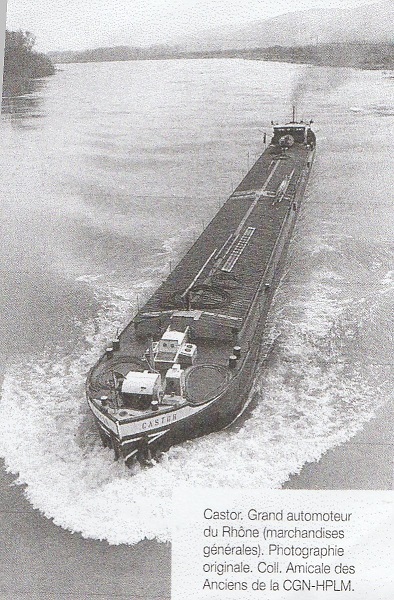 Curieusement, il a sa devise et la légende est : "Castor. Grand automoteur du Rhône (marchandises générales). Photographie originale. Col.Amicale des Anciens de la CGN-HPLM.