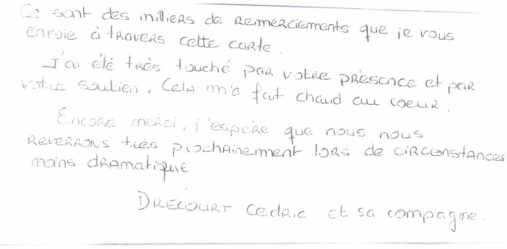 Et là je dis chapeau bas à Emmanuelle et Cédric car malgré leur malheur, ils remercient personnellement les donateurs en renvoyant un courrier !