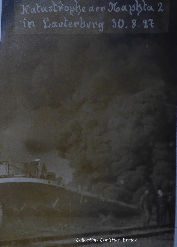 La péniche NAPHTA (sic) qui se trouvait sur le Rhin, près de Lauterbourg, portait un chargement d'huiles destinées aux mines de Pechelbronn. Le 29 août au soir, le déchargement était très avancé et il ne restait plus que 70 tonnes d'huile à bord. Subitement, vers 2h20 du matin, la ville de Lauterbourg fut réveillée par une détonation formidable. Le navire venait de sauter. Les pompiers se rendirent immédiatement au lieu du sinistre, mais il était impossible de porter secours. Le navire entier était en flammes. L'équipage parvint à se sauver en se jetant à l'eau. Le capitaine surpris dans le sommeil fut atteint par le feu et grièvement brûlé. Il parvint cependant à se jeter dans le fleuve où il disparut. Son corps n'a pas encore été retrouvé. Le capitaine de la péniche incendiée se nomme Richard Swienty, 47 ans, célibataire, originaire de Gelsenkirchen. Sa soeur et sa nièce qui se trouvaient également à bord ont pu être sauvées, mais son grièvement brûlées.