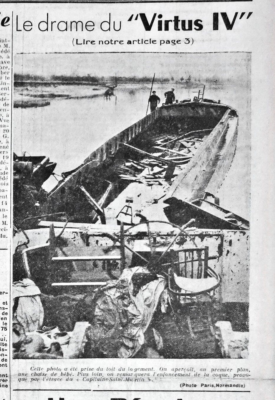 Sous l'influence du choc, le "Capitaine-Saint-Martin" fit une embardée droite et vint éperonner par le travers le "Virtus-IV", qui roula sous l'étrave et se retourna sans couler, des poches d'air s'étant produites à chaque extrémité du chaland.
