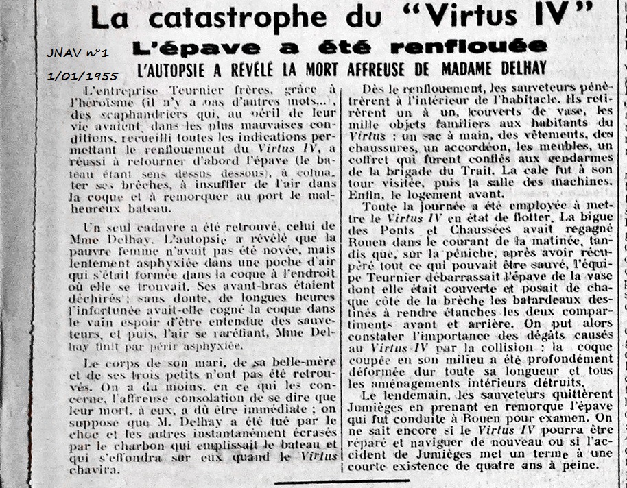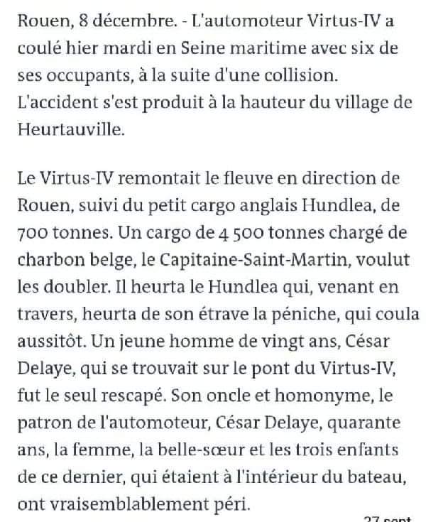 Cet événement très douloureux a mis en deuil le port de Rouen et les usagers de la Seine Maritime. Quatre enfants survivants de la famille du marinier étaient, en effet, élevés au Havre et nous les assurons de notre sincère participation à leur cruelle peine.