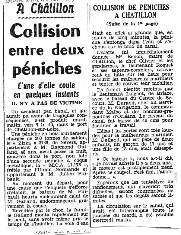 Le 10 ou 11 décembre 1963 une collision entre deux bateaux s'est produit à Chatillon sur Loire?