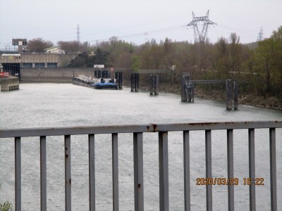 A 18 h 30 ce jour : une grue travaille vers la porte aval. Elle est située sur la plage amont au pied du mirador.
