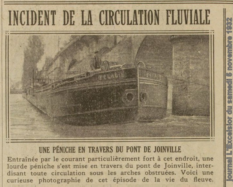 Entraînée par le courant particulièrement fort à cet endroit, un lourde péniche s'est mise en travers du pont de Joinville, interdisant toute circulation sous les arches obstruées. Voici une curieuse photographie de cet épisode de la vie du fleuve.