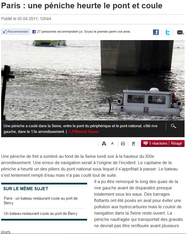 capitaine Ehike a écrit:Tiens c'est étrange il me semble bien avoir déjà vu ce bateau heurter un bateau logement à conflans en été 2008... Déjà des problèmes d'hydrolique.. C'est vraiment pas de chance! J'aimerais pas être l'assureur.c'était le Troïka me s'emble t'il qui l'avait sortie de là!