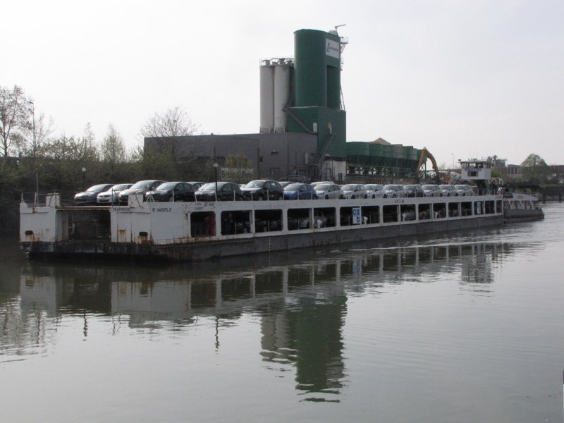 Chaque convoi - dont nous avons un aperçu sur le cliché - représente une longueur totale de 157 mètres pour une largeur de 11,50 mètres et comporte trois éléments dissociables: à l'arrière, le pousseur (élément moteur) et devant, les deux barges en flèche (éléments porteurs) chargées au total de 526 voitures automobiels sur trois niveaux (seuls, le pont principal et le pont supérieur sont visibles, le troisième niveau étant constitué par la cale).