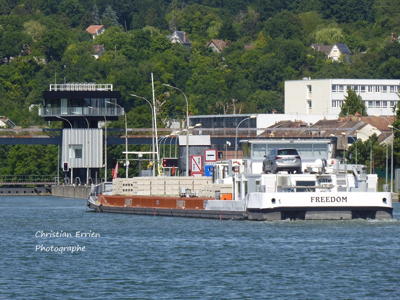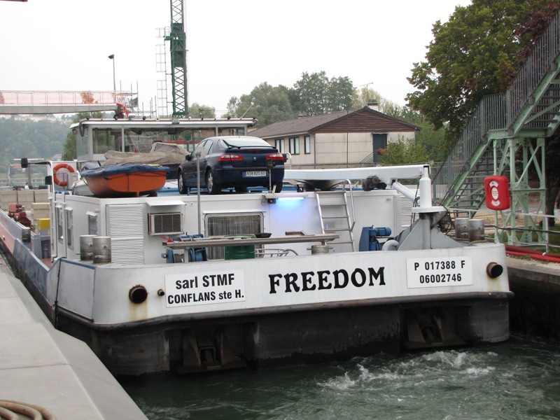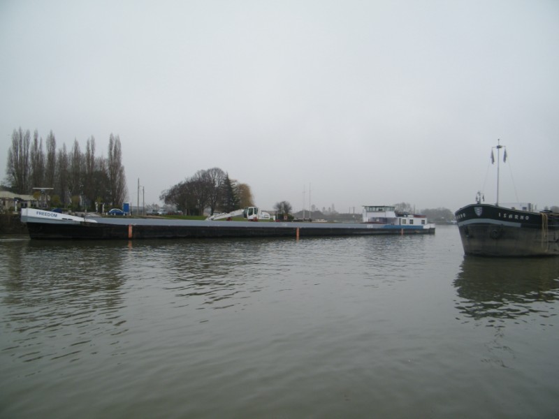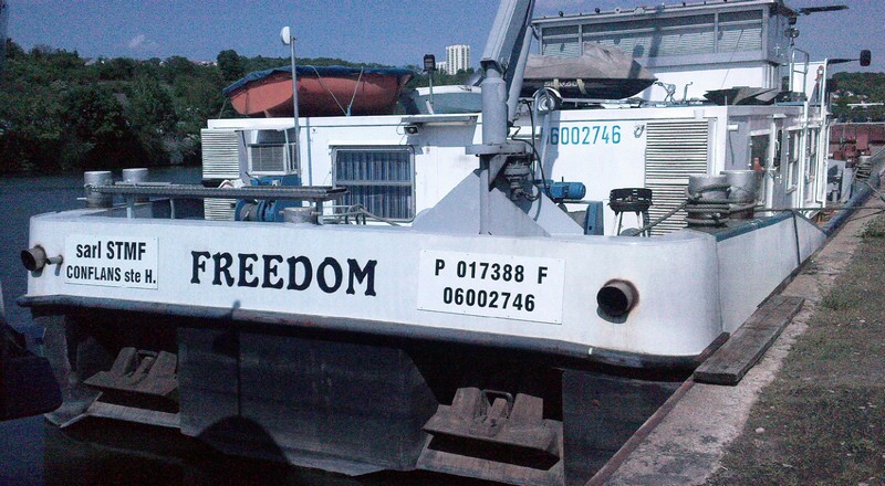 FREEDOM bateau un peu particulier parce qu' il a en plus des transports, il fait la manutention a l'aide de sa grue il se charge et vide tous seul comme le prouvent les photos suivantes sur il y asur la seine que 4 bateaux equippe comme celui ci