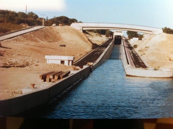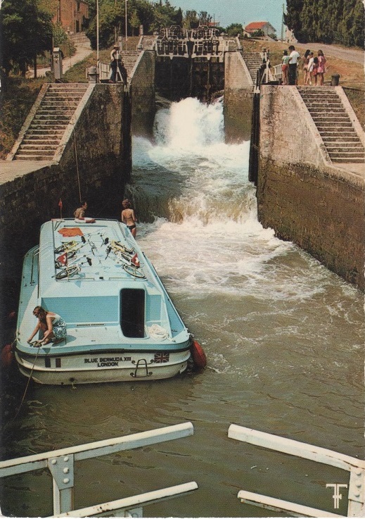 Tout pimpant neuf- on rigolait beaucoup pour le passer parce qu'a chaque passage il y avait un incident de parcours, souvent la flotte fuyait sous la pelle et il fallait laisser descendre un petit tsunami depuis la porte amont. Il a pas fonctionné longtemps, dans la pluie, avec le Papillon, on est descendu a 4 fois la vitesse normale avec les pneus qui glissait et le hydraulique qui ne freinait pas, la pelle a envoyé une vague de 1m20 a travers le pont canal sur l'Orb, et mise un batea de location en fâcheuse posture sur le chemin de halage. Apres cela, je ne suis jamais monté avec la machine un autre fois!