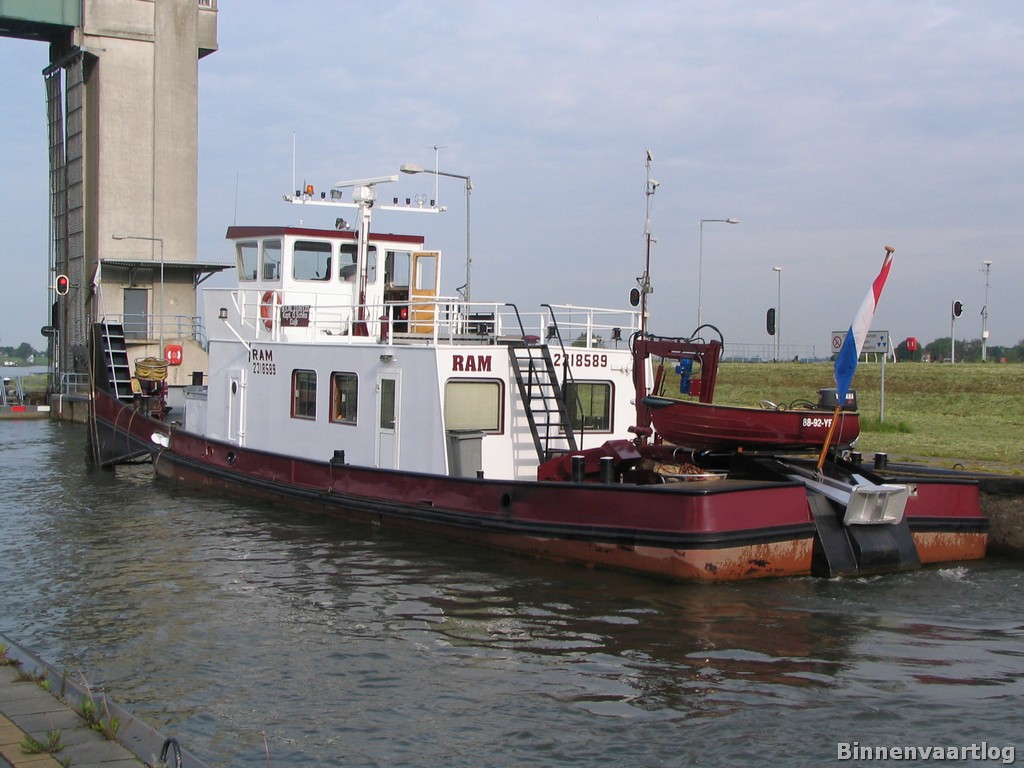Ram , 22,10 x 5,74 x 2,00 , 23 ton , Bouwjaar 1943 , Werf Schimag in Mannheim ( Duitsland ) , 2 x 400 Caterpillar, ex D 037 , ex M 291 , ex Guido , ex Ram , eigenaar Ranatrans Binnencsheepvaart VO in Katwijk (NB) , ENI 02318589