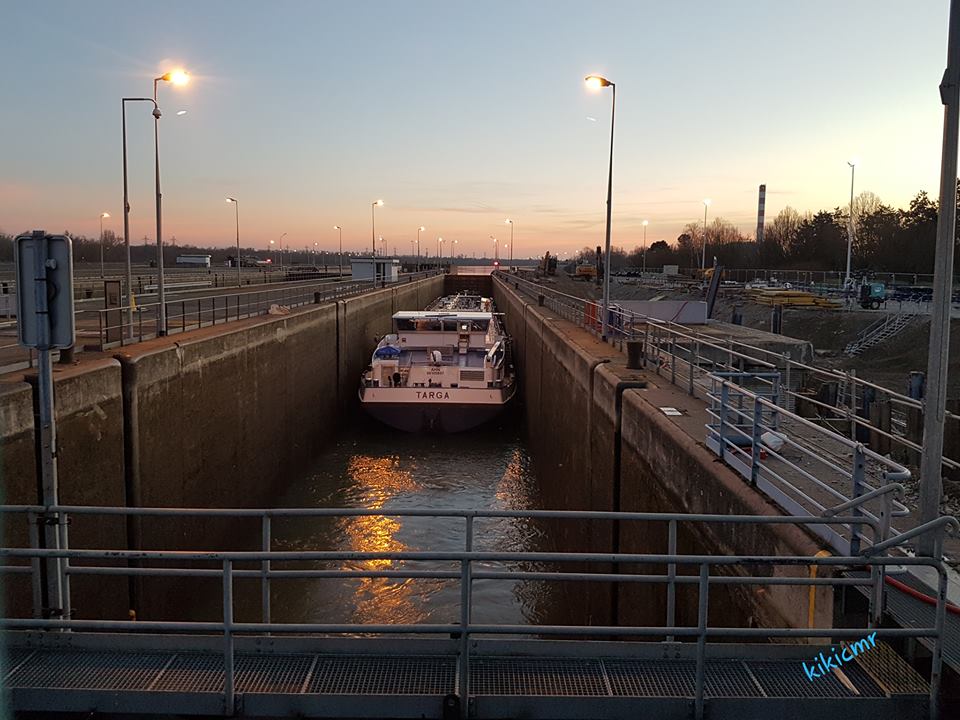 Un 110 mètres-citerne luxembourgeois montant à l'écluse de Strasbourg, en cette fin d'après-midi de veille de Saint-Valentin :