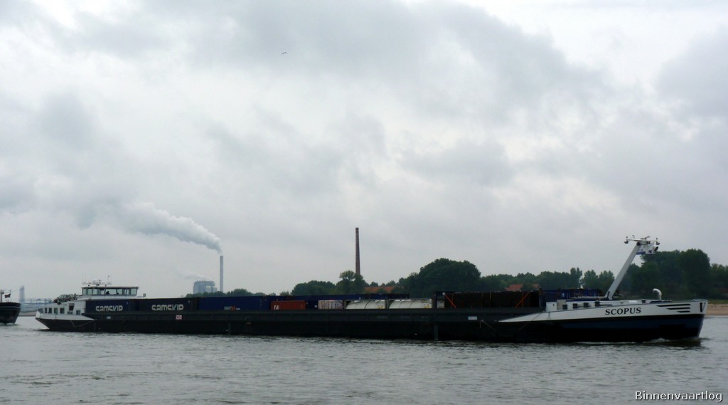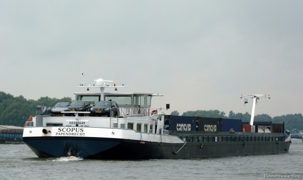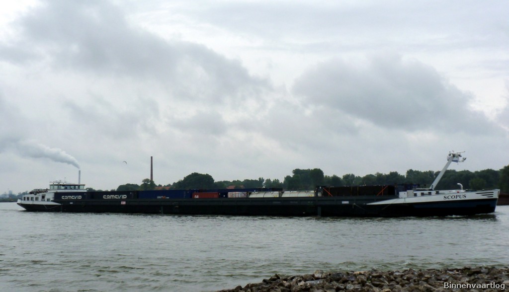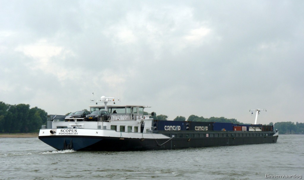 Scopus , 110,00 x 11,45 x 2,50 , 1906 ton, Bouwjaar 2007 , Werf Santierul Naval SA in Orsova ( Roemenië ) en De Gerlien van Tiem BV in Druten ( Nederland ) , 1521 pk Caterpillar en 608 pk Caterpillar Verhaar Omega-Jet boegschroef , eigenaar Scopus Vof in Papendrecht , ENI 02328649