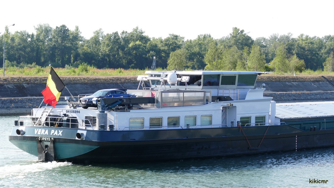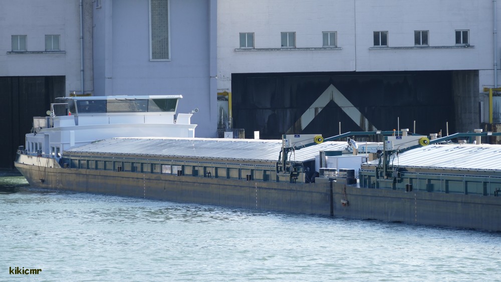 Un convoi-couplé construit en 2017 au Chantier Naval d'Orsova (R) et aménagé par Veka à Werkendam (NL), avalant en juillet 2018 à l'écluse de Fessenheim (68), sur le Grand Canal d'Alsace ; voici l'automoteur-pousseur :