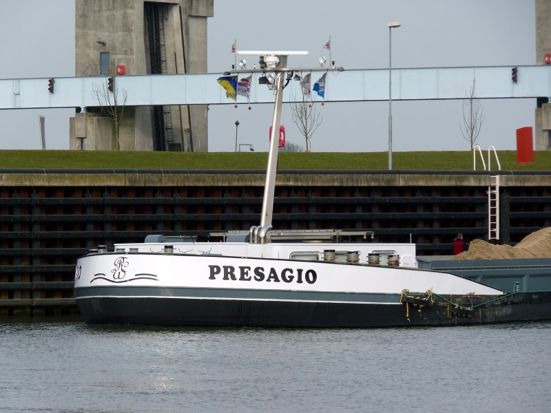 Presagio , 109,95 x 11,45 x 3,63 , 3202 ton , Bouwjaar 2006 , Werf Santierul Naval SA in Orsova ( Roemenie ) en Veka in Werkendam , 1835 pk Caterpillar en 530 pk DAF van Wijk kopschroef , ex Govert Sr , eigenaar R.E.L. Willaert in Evergem , ENI 02327617