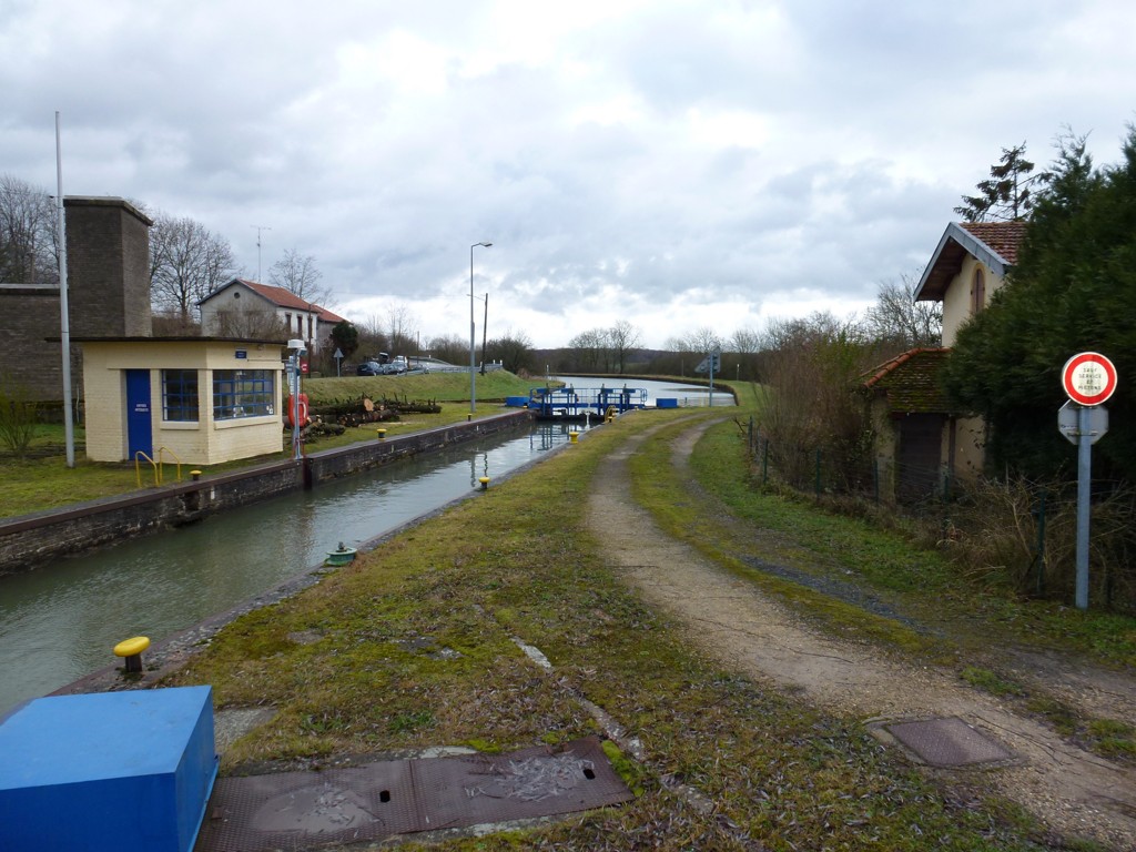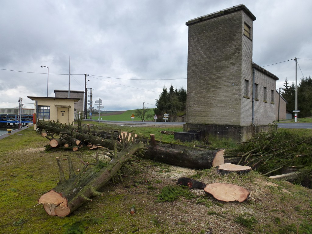 Ils dépassent de loin les constructions annexes à l'écluse, bâtiment des pompes et transformateur électrique :