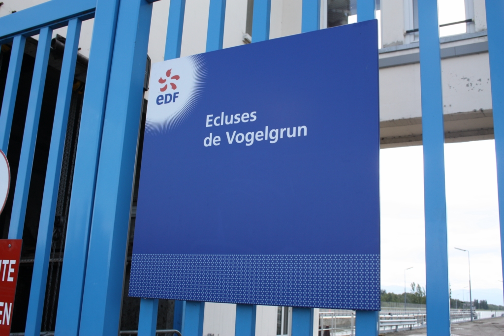 Cette écluse de Vogelgrün est la dernière du Grand Canal d'Alsace ; en aval, le Rhin a été aménagé par d'autres techniques que le canal latéral.