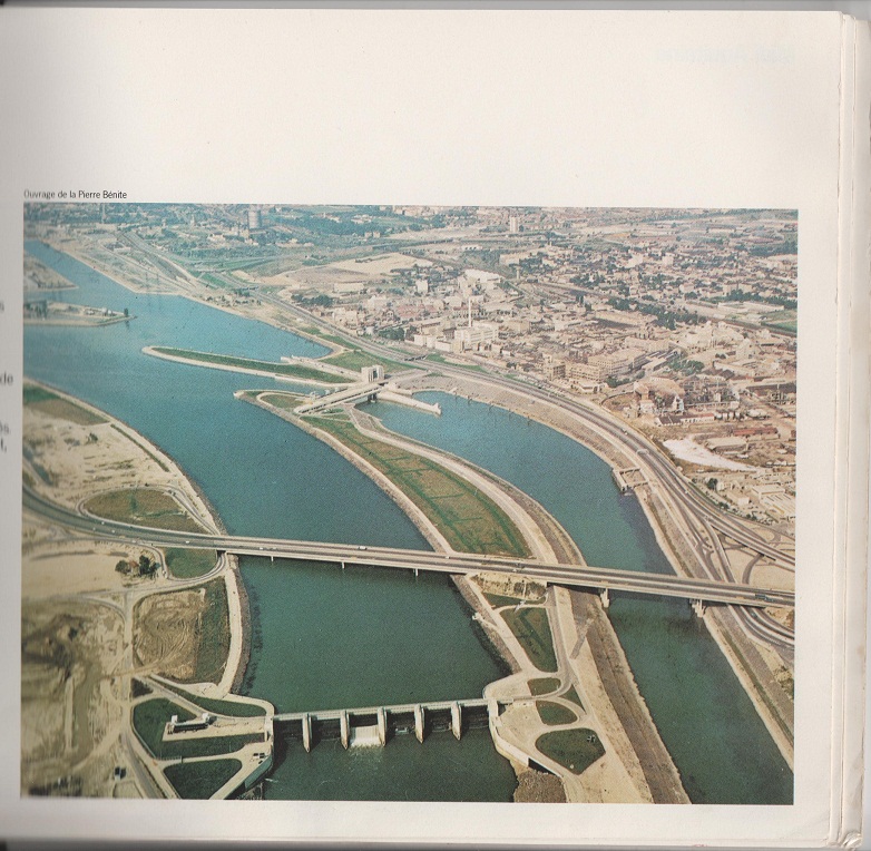 C'est,une belle vue de l'ouvrage de Pierre-Bénite, tirée de le revue "La voie navigable, UNE VOIE D'AVENIR" de 1977. Comme pour tous les barrages rhodaniens de l'aval de Lyon, le barrage est sur l'ancien Rhône, mais fait singulier, ici il est plus au sud que l'usine-écluse. Vaugris, barrage suivant en avalant, se distingue aussi, car il regroupe barrage, usine et écluse.