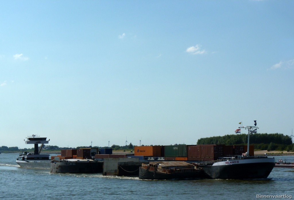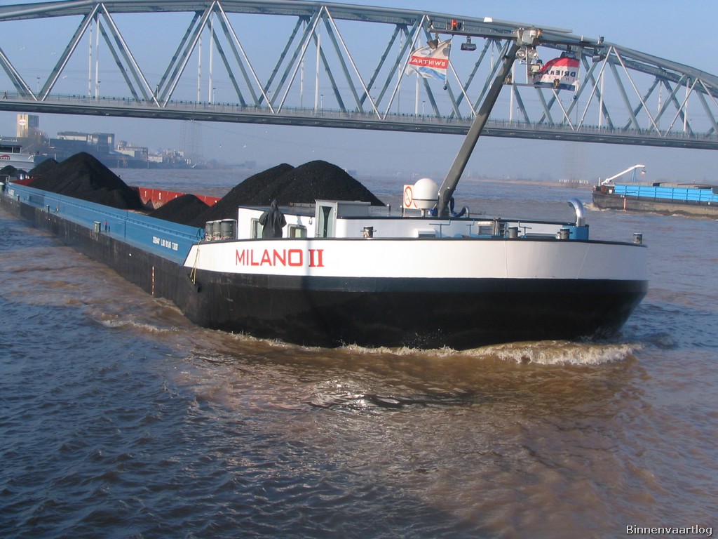 Milano II , 90 x 11,45 x 3,75 , 3037 ton , Bouwjaar 2003 , Werf Begej Shipyard in Zrenjanin ( Servie ) en van Wijk in Werkendam ( Nederland ) , 2 x 608 pk Caterpillar Verhaar Omega-Jet boegschroef , eigenaar Milano BV in Hendrik-Ido-Ambacht , ENI 02326447