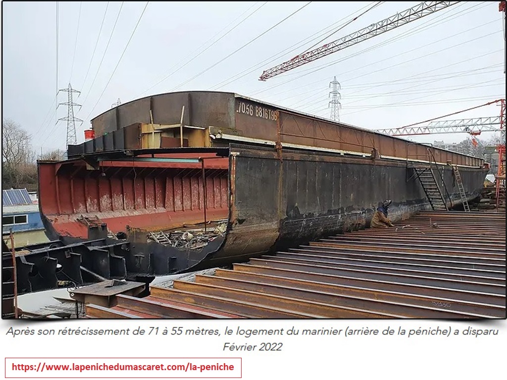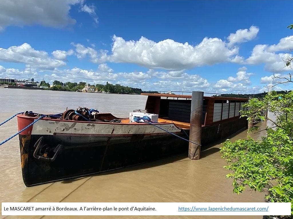 Sur un site très documenté en explication technique et en photos on apprend que ce bateau va devenir une salle évènementielle sur la Dordogne, à l’adresse 13, Route de la Dordogne, 33240 Saint Germain de la Rivière.