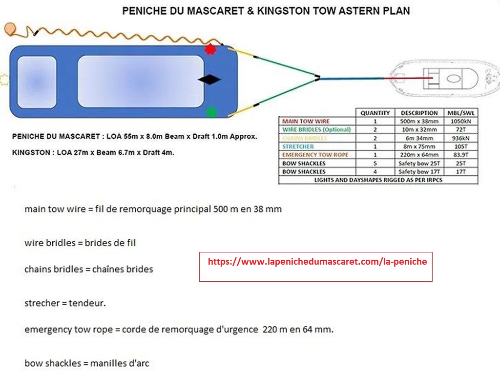 Un schéma explique la technique du remorquage. La longueur du câble de remorque doit dépendre du lieu et de l’état de la mer. Mais à priori c’est en centaine de mètres.