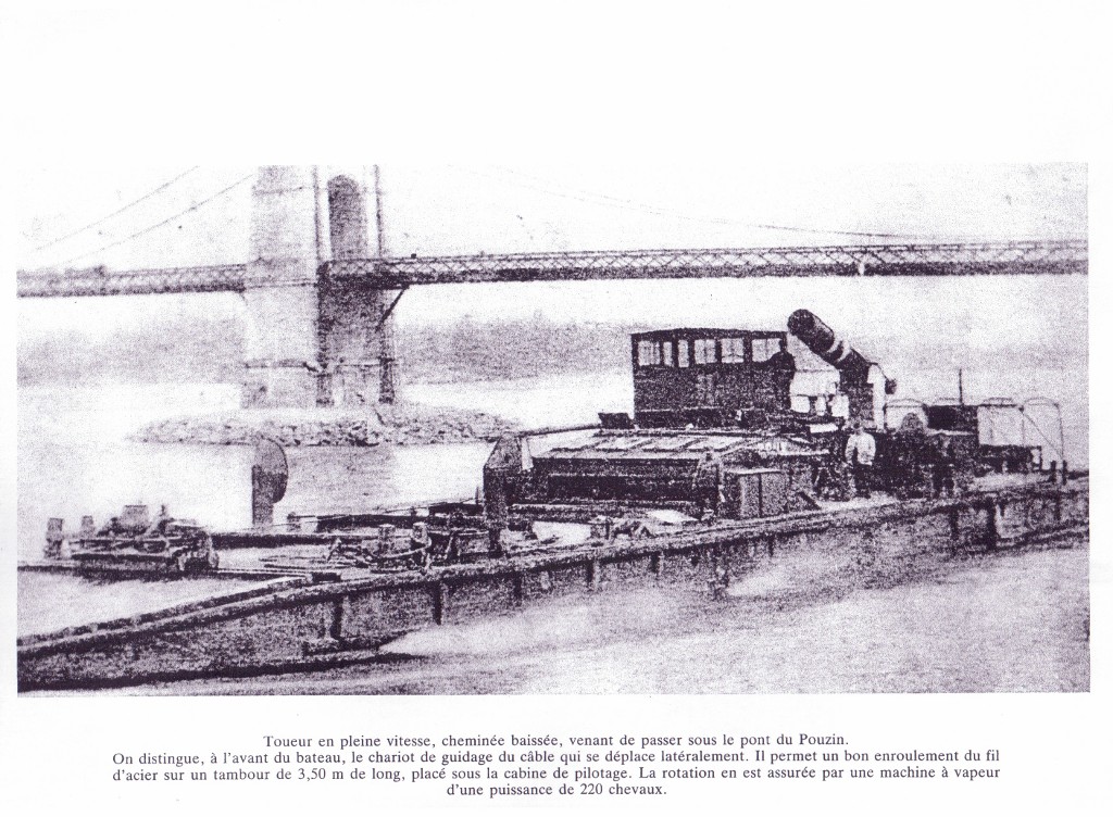 "52,20 x 7,50 m, tirant d'eau de 0,90 m, câble enroulé,..., 200 cv, résistance à la rupture du câble, 36 tonnes,..., 3 hommes de pont et trois hommes de machine..."