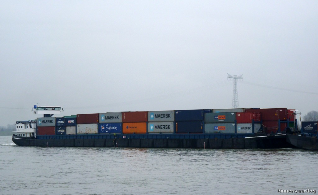 Guna , 134,87 x 12,00 x 3,31 , 3489 ton , Bouwjaar 2000 , Werf Fulton in Hemiksem ( Belgie ) , 2 x 2028 pk Caterpillar en 2 x 610 pk Caterpillar van Tiem boegschroef , eigenaar P. Oom in Kapellen , ENI 06003589
