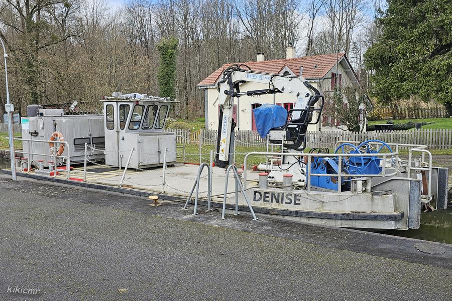 Le ponton multifonction de VNF en service sur le canal des Houillères de la Sarre, mis en service en 2010, dans l'écluse n°16 d'Altwiller (67) en mars 2024 :