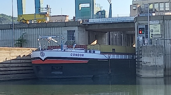 Je l'ai suivi pendant son éclusée à Tarascon, ce vendredi 29/01/2016 vers 10 h 30. Avalant, il était chargé de billes de bois pour l'usine de pâte à papier située juste en aval. C'est effectivement un superbe bâtiment. Après avoir attendu le feu vert, il est en entré et sorti "au pas", et n'a vraiment accéléré qu'à la sortie du musoir aval.